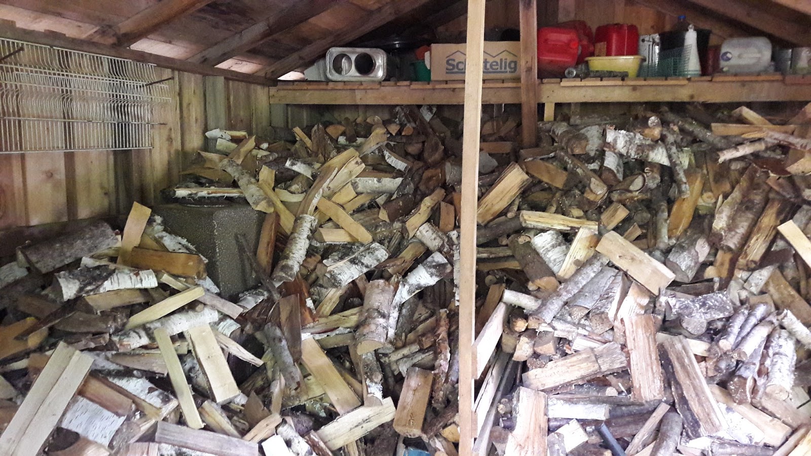 Polttopuuksi meillä kasvaa ja kaatuu niin paljon materiaalia, että sitä ei ehditä pilkkoa eikä edes käyttää siinä tahdissa kuin tulee. Tämän kesän pölkkyjä jäi useaan pinoon odottamaan ensi kesää ja kirvestä.